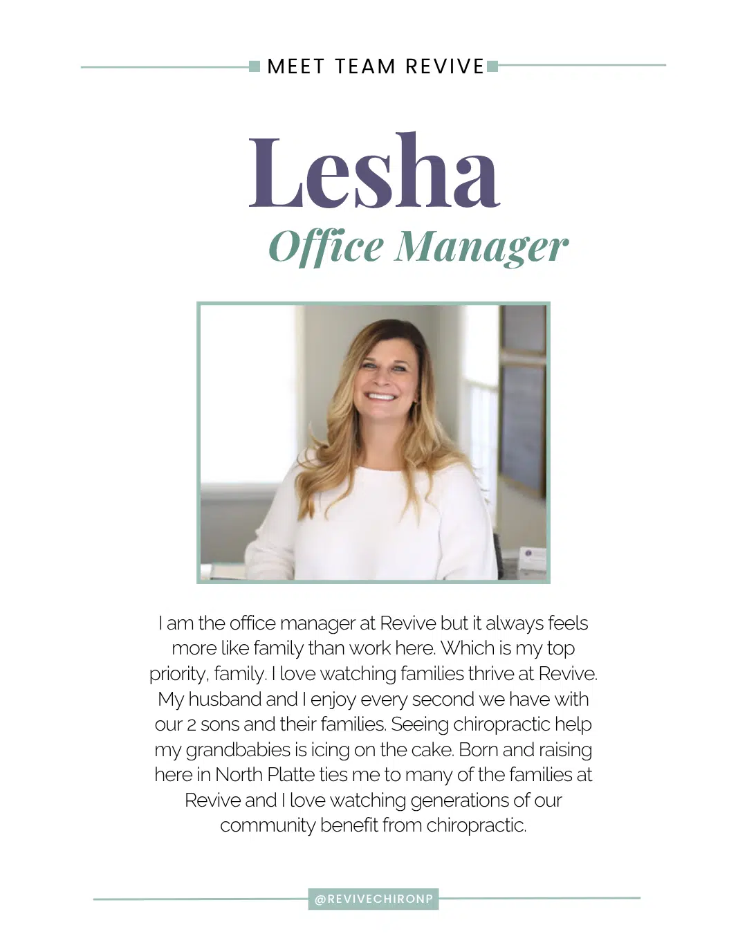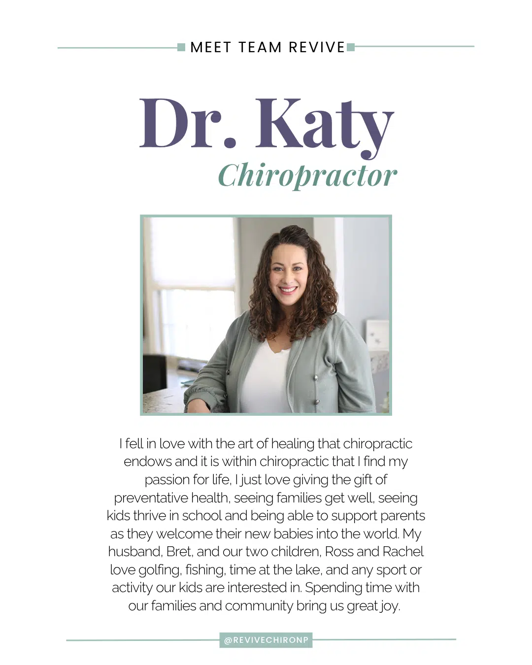 At Revive Chiropractic, your family receives the exceptional care it deserves. North Platte chiropractor Dr. Katy Collins gives each person, no matter how old or young, who walks through the door abundant attention and exceptional spinal care. She specializes in family wellness with a focus on pregnancy and pediatrics.
